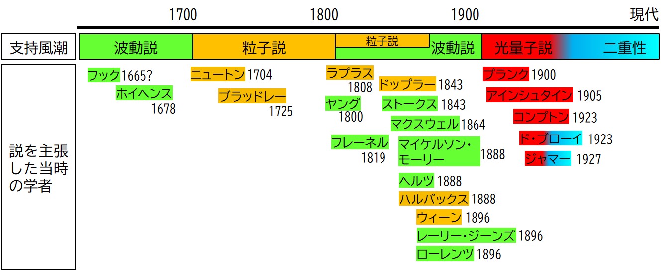 2つの説 図1に示すように光の持つ性質はフックによって波動性が17世紀半ばに唱えられてから始まった。波動性とはその名の通り、波の性質(波紋を思い浮かべてください)です。波の性質をもちいてホイヘンスが反射や屈折の性質を証明しました。しかしながら、光が伝わる媒体がなにか?また、光の干渉や回折の現象が証明できませんでした。その後、ニュートンが18世紀に著書「光子」で光の性質は粒子性(光そのものが実体をもつ:粒のようなモノである)を主張しました。粒であるならば直進性や反射性などを説明しながら、干渉や回折が起こらないという当時の観測結果を満足に説明でき、それまでの波動説を一転させてしまいました。ただし、粒子説にも次の点で課題がありました。光の速度が一定であることに反すること。水などとの界面で起こる反射と透過を区別するものはなにかわからなかったことが挙げられます。このように光のもつ性質を解明するために、物理学会では粒子説と波動説の2つが実験結果にもとづいて主張され、20世紀に入るまで時代ごとに入れ替わっていたことがわかります。