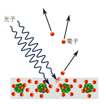 光量子仮説 1905年、プランクからすぐ後にアインシュタインは光量子仮説を提唱しました。光が「光子(こうし)」と呼ばれるエネルギーの塊として振る舞うとする仮説です。エネルギーの塊とはまさに「粒子」ですよね。ニュートンから始まった粒子説がアインシュタインによって極まりました。時代は遡って1888年にハルバックスは、光を金属に当てるとその金属が帯電状態を失う現象を発見しました。この現象は図2に示すような「光電効果」の一種で、光の粒子が金属に作用して金属から電子を放出させ、金属の帯電状態を変えたことを示しています。