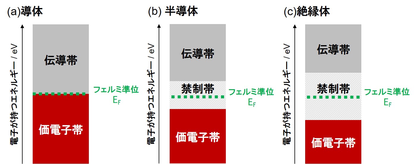電子構造 図1に半導体の電子構造を示します。比較として、導体と絶縁体の電子構造もあわせて掲載しました。電気を通したり通さなかったりする理由はなんでしょうか。通電するキーポイントはキャリアである電子が生じるかどうかです。図1(a)に示す導体の電子構造と図1(c)に示す絶縁体と比較すると、価電子帯と伝導帯が空間的に離れた構造を形成して、その空間に禁制帯ができることを前回説明しました。図1(b)を見ると、半導体では価電子帯と伝導帯が空間的にやや接近し、禁制帯の幅(バンドギャップ)が絶縁体よりも小さくなることがわかります。半導体の価電子帯の電子は絶縁体と同様に基本的に自由に動けません。ただ、半導体はバンドギャップが小さいので“条件が整えば”電子が動けるようになります。これが電気を通したり通さなかったりする理由をもっとも簡単に説明しています。なぜバンドギャップが小さくなるのか、それは物質固有の本来持ち合わせた性質になります(後続の稿で電子構造が形成される理由とあわせて説明します)。