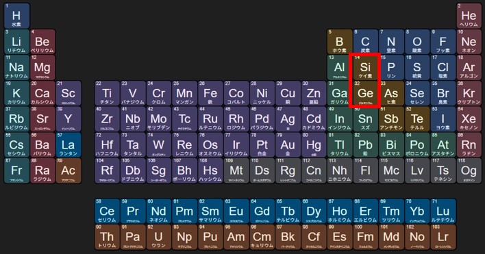 真性半導体 “真性”という言葉に身構えますが簡単です。不純物を含まず極めて純粋な状態のことを指します。その例として超高純度シリコンが挙げられます。基本的に単一元素からなる半導体のことを言うそうですが、化合物半導体の場合でも純度が高いものを指すことがあります。真性半導体の電子構造はまさに図1(b)に示すもので、フェルミ準位は禁制帯の中央に位置します。真性半導体において光や熱のエネルギーによって通電回路ができる場合、キャリアとなる電子は価電子帯から伝導帯への励起によってのみ生成します。代表的な真性半導体の材質は図2の赤枠内に示すシリコンとゲルマニウムです。これら2つの単体は周期表の同族元素で似た性質を持ちます。
