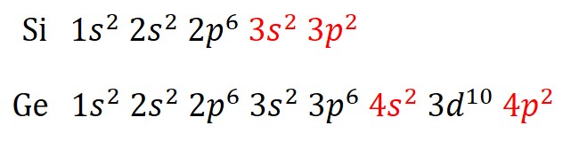 電子配置 シリコンとゲルマニウムの電子配置を図3に示します。s, p, dのアルファベットは電子が周回する軌道の種類、1, 2, 3, 4は主量子数という軌道のサイズ(径のようなもの)、上付き数字は各軌道に格納される電子数を表しています。s軌に2個、p軌道に6個、d軌道に10個それぞれ電子が格納できる最大数です。赤に反転した部分は各原子の価電子に相当する電子を表しました。価電子は他の原子との反応などで原子間結合を形成するときに使われる電子です。価電子は導体(金属)でいう自由電子に相当します。高校化学で説明すると、K, L, M殻にそれぞれ格納された電子というと理解できるかもしれません。すなわち、シリコンは最外殻に電子を4個持っています。ゲルマニウムも最外殻に同じ電子数をもつことがわかります。ちなみに、両者の価電子数が等しいため、シリコンとゲルマニウムは似たような性質を持っています。