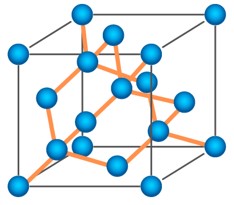 結晶構造 最外殻電子(価電子)は結合形成に寄与することはシリコンの結晶構造で説明できます。図4にシリコンの結晶構造を示します。ちょっとわかりにくいですが、この結晶構造はダイヤモンドと同じで、1個のSi原子は4個のSi原子と結合しています(ちなみに炭素とシリコンも周期表で同じ族)。価電子数が4個なので、Si-Si結合をつくるときに互いに電子を1個ずつ共有し、合計4つの結合が形成されます。