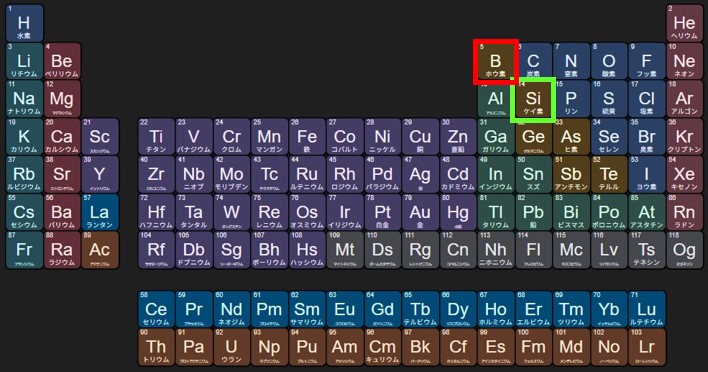 p型半導体 シリコン真性半導体をp型半導体に変化させるドーパントは、シリコンの価電子より1個電子が少ない元素が選択されます。図1に示す周期表を見ると、14族のシリコン(Si:緑枠)の左上の元素はホウ素(B:赤枠)です。周期表でシリコンの左側の13族元素の価電子数は1個少なくなります。