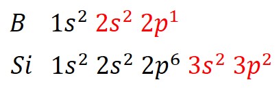図2に示すように、シリコン(Si)の電子は3sと3p軌道に4個存在し、これが価電子です。一方で、ホウ素(B)は2p軌道に電子が1個だけで、価電子の合計が3個です。ちなみに価電子の軌道の大きさが異なりますが、シリコンは第3周期の元素で主量子数が3ですが、ホウ素は第2周期の元素で主量子数が2であるためです。