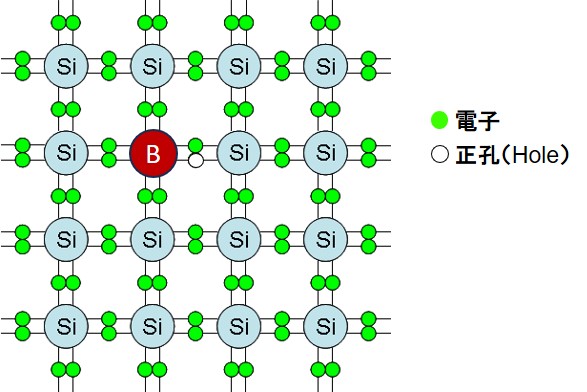 ホウ素をドーピングしたシリコンの結晶格子を二次元で表すと図3のようになります。シリコン原子を置換したホウ素原子は電子が1個少なくなります。シリコン原子とホウ素原子が結合を形成した結果、シリコンから電子を供給されたホウ素原子は負の電荷をもちます。一方で、電子が1個少なくなったトータルの電荷を補償するため、ホウ素原子の周囲には正の電荷を帯びた空孔(正孔:Hole)が生成します。負電荷を帯びたホウ素原子は正孔を束縛して電荷を補償しますが、その際シリコン原子から電子を捕捉しやすい(ホウ素原子近傍の正孔にシリコン原子から電子が近づきやすい)状態となります。正孔は正(Positive)の電荷をもつため、Positiveの頭文字をとってp型半導体と呼ばれます。p型半導体に変化させるドーパントはホウ素の他にアルミニウムやインジウムがもちいられます。