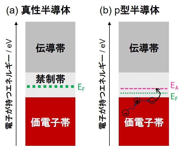 価電子4個のシリコン真性半導体に価電子3価の微量元素(ホウ素、インジウムなど)をドーピングすることによって電子が1個不足します。電子が欠損するので総電荷を補償するために正電荷をもつ空孔(正孔)が生成し、価電子帯上端の上側の禁制帯中にアクセプター準位(EA)を形成します。正孔はシリコンの価電子から電子をすぐに結合するため、動いた電子のもともとの位置に正孔が移動したように見えます。これはまさに、正電荷をもつ正孔がキャリアとして動いている状態となります(実際は電子が動いている)。電荷をもつキャリアが動くことはすなわち、通電回路が形成されることを意味しています。これはn型半導体の場合と同じ現象が起きています。価電子帯上端とアクセプター準位(EA)のエネルギーギャップ(差)が小さいので、光や熱の外部刺激によって価電子帯の電子が励起されるエネルギーが小さく済みます。フェルミ準位EFはアクセプター準位に接しておらず、電子は特定のエネルギーをもつ外部刺激にしか励起せず、導体のような通電は起こりません。p型半導体も通電させたり絶縁させたりと、電気伝導性を制御(スイッチング)することが可能となります。違いはキャリア発生に起因する電荷が正か負の違いだけです。