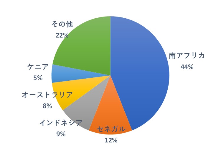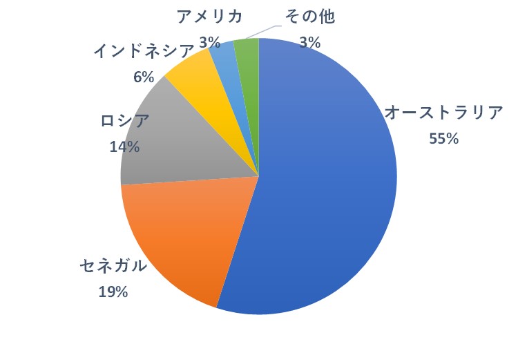 ジルコニアの原料を輸入する日本の相手国を図4に示します(出典:独立行政法人エネルギー・金属鉱物資源機構、JOGMEC)。産地はアフリカ、東南アジアおよびオーストラリアが主なところです。このような状況で日本は図3に示すようにオーストラリアから半分以上輸入しています。前述したように、ジルコニア原料もオーストラリアから多くを輸入していることがわかります。アルミナ原料のボーキサイトと同じような構図です。注)図の統計は2020年のものですから、現在ロシアからの輸入はないでしょう。