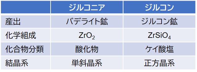 ジルコニアとジルコン 両者は完全に別物です。よく混同して話す方を見かけますが、完全に違います。前述したように、ジルコニアの化学組成はZrO2で、ジルコンはZrSiO4です。表1に両者の違いを比較しました。ご覧のとおり別物であることがおわかりいただけます。類似する点をあえて言うと、ジルコンからジルコニアが製造されることです。