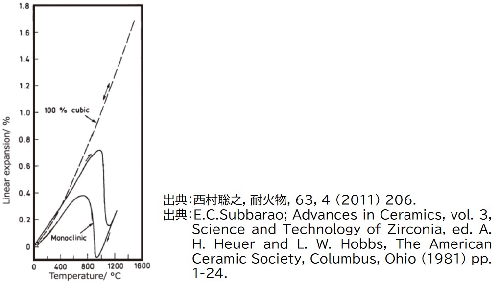 図1に単斜晶と立方晶のジルコニアの熱膨張曲線を示します。単斜晶(Monoclinic)のジルコニアの熱膨張曲線は加熱過程において1000℃付近で急激に下降します。これは加熱により収縮していることを示しています。その後、1100℃を超えると再び上昇しています。これは膨張していることを示しています。加熱過程だけで膨張⇒収縮⇒膨張を繰り返します。